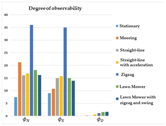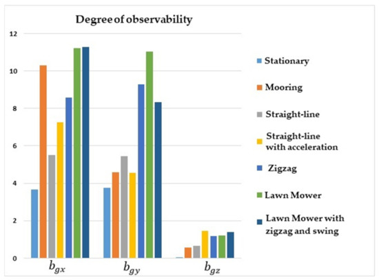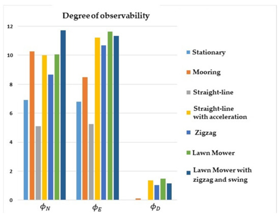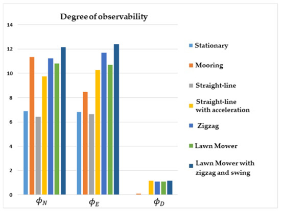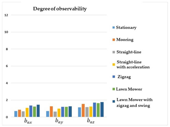 Concerning the accelerometer biases, Figure 7 shows that the degree of observability of was higher for lawn mower maneuvers, straight line with acceleration, and zigzag, and lower for stationary, mooring, and straight line with constant speed maneuvers. For and , the degree of observability was higher for maneuvers with acceleration or oscillation. It is worthy of note that, although the degrees of observability of the accelerometer biases were increased with lawn mower and zigzag maneuvers, the differences with respect to the remaining maneuvers were not significant.