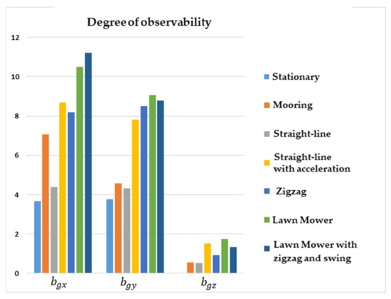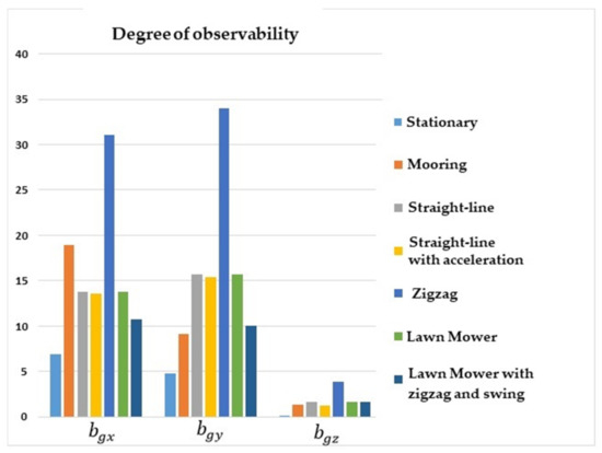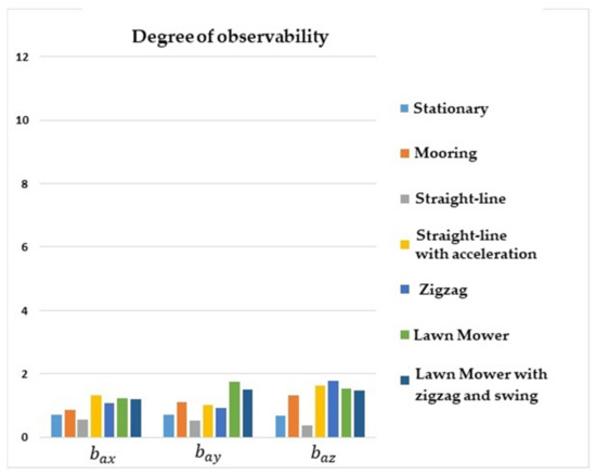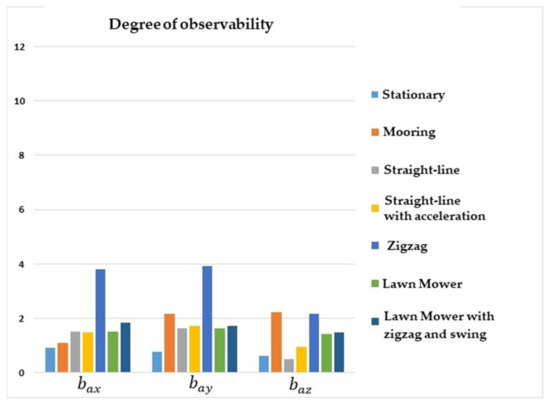 Concerning the gyro biases, the degrees of observability were lower for the stationary maneuver, and higher for zigzag, as illustrated in Figure 10. For the accelerometer biases, Figure 11 shows that the degrees of observability were higher for zigzag and mooring (), and lower for the stationary maneuver.