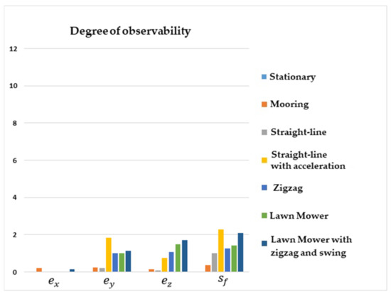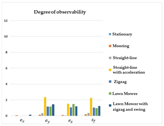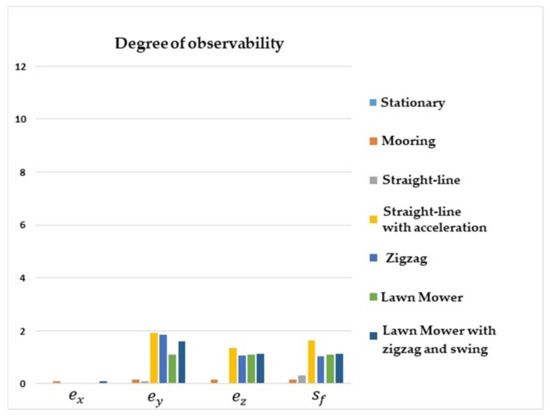 Figure 6 shows that the lowest degrees of observability for were obtained for the stationary and straight-line with constant speed maneuvers, and the highest degrees for mooring, lawn mower, and zigzag maneuvers. Regarding , the lowest degrees of observability were obtained for the stationary, mooring, and straight-line maneuvers, and the highest degrees were for lawn mower and zigzag. For , the lowest degrees of observability were obtained for the stationary, mooring, and straight-line with constant speed maneuvers, and the highest were for lawn mower, zigzag, and straight-line with acceleration maneuvers.