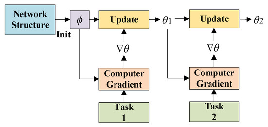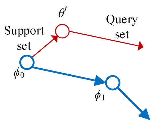 The MAML meta-gradient update involves a gradient through a gradient, i.e., MAML is based on a secondary gradient, which provides many flexibilities for MAML to adapt to different models. The MAML update process is shown in Figure 1. Define the model as f, the parameter of the model as ϕ, and its initialization parameter as ϕ0. For discrete classification tasks with a cross-entropy loss, the loss is: