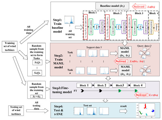 In this paper, based on MAML, we proposed a model named model-agnostic meta-baseline (MAMB), which performs few-shot fault detection for multiple faults of wind turbine generator bearings and gearboxes, and the model structure is shown in Figure 4. A small number of existing fault samples of the wind turbine were used to build a meta-learning model, and the model was updated through meta-tasking, which could effectively detect the faults when the same faults occurred again.