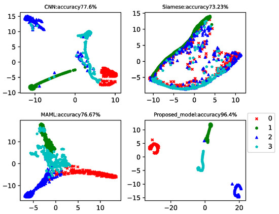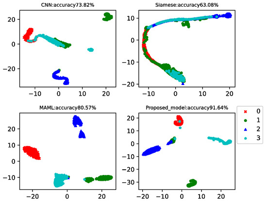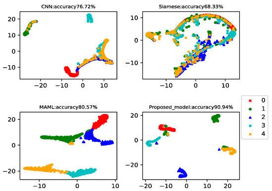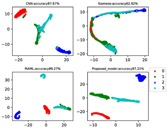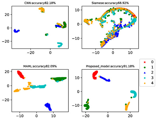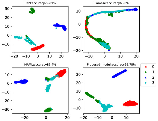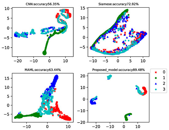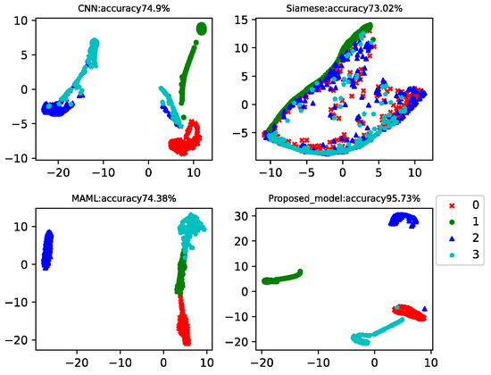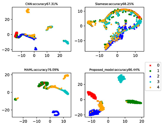 This case analyzed the results of four-way-one-shot, four-way-five-shot, and four-way-ten-shot, respectively, and compared with CNN, the Siamese net [7], and the MAML net [40]. The final t-SNE is shown in Figure 8, Figure 9 and Figure 10. The accuracy is displayed at the top of each chart.