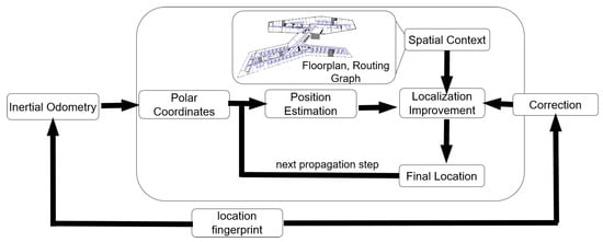 Overview of the structure of the developed algorithm that uses particle filtering as a map-matching process. Starting from a position derived, for example, through a location fingerprint, odometry data from inertial measurements are transferred to polar coordinates, resulting in the estimation of the propagated position. This estimation is improved via spatial constraints and further corrected by additional information from the location fingerprint, resulting in the final position estimate, which serves as the starting point for the next propagation step.
