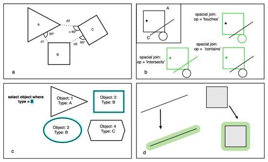 - Query by attribute returns all objects of the given GeoDataFrame that hold the queried attribute value, as shown in Figure 2c, where all objects with the Type value of B are selected and marked in blue;
