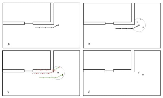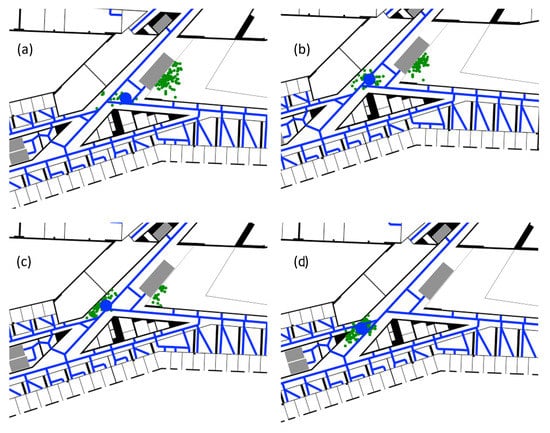 Example of the trajectory correction (from (a–d)) through the backtracking functionality, where the green dots represent the valid, propagated particles, and the blue dot is the resulting position estimate. First, most particles took a “wrong” path (a), continuously getting deleted when trying to pass the wall (a–c). While more particles are getting deleted, more particles with plausible trajectories are getting created through the backtracking process, until all particles are recovered and now only represent positions with reasonable trajectories again (d).