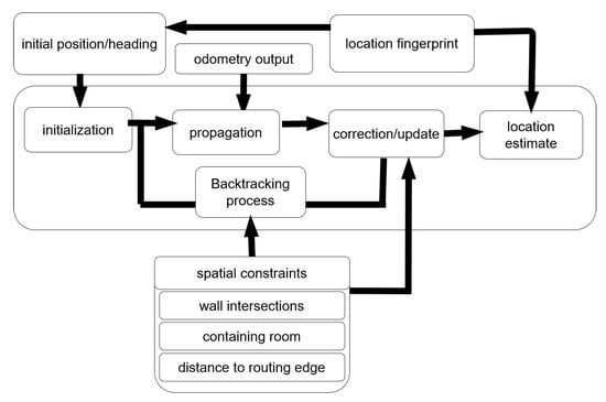 Overview of the particle filter algorithm. The initial position and heading, derived from the location fingerprint, is used for the initialization of the particles, which are then propagated according to the odometry output. The particles are then filtered in the correction/update according to spatial constraints, leading to a final location estimation, which is further improved by the location fingerprint. Via the backtracking process, the number of valid particles is increased up to the original amount of particles by considering spatial constraints. Next, the next propagation step starts.