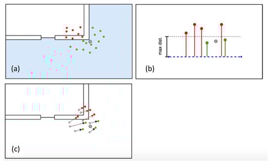 For this paper, three filtering methods for the validity of particles have been used, namely the checking by line of sight (cl), checking by rooms (cm), and checking by distance to the routing graph (cr) concept. For the cl (see Figure 3c), a GeoDataFrame is created containing all the connections between each propagated particle and its previous position. Every particle whose corresponding connection line intersects a wall is deleted, while all other particles are kept in the GeoDataFrame. Finally, the GeoDataFrame with the remaining particles is returned. The cm (see Figure 3a) concept is similar to cl. However, here, the walls are not required as map information, but the rooms, considered as valid for the particles (), and doors. For each propagated particle, it is checked if it is either within one of the valid rooms or if the LineString-geometry from its new and its previous position intersects either with any door-polygon or any polygon contained in . If that is the case, it is appended to the valid particles, which are finally returned as a GeoDataFrame. Rooms, which are entered by particles through doors are added to the list of valid rooms and kept valid as long as particles are inside them. In the cr concept (shown in Figure 5b), for each propagated particle, the smallest distance to the routing edges is determined. Only if the smallest distance to the routing edges for a particle is smaller than 2 m, is it then appended to the list of valid particles. The valid particles are then, as for the other concepts, returned as a GeoDataFrame.