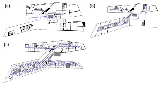 Floor plans of the ground floor (a), 1st floor (b), and 4th floor (c), with the blue lines representing the routing edges.