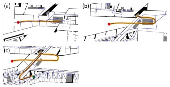 This was also an exception, where the weighting of the particles corresponding to the distance to the nearest routing edge helped to significantly increase the accuracy to less than 4.5 m in 90% of steps, by correcting the trajectory closer to the next routing edge (see Figure 12). Since the “gallery” does not contain any routing edges, the trajectory was directed back into the corridor. The effect of the weighting method was negligible for the other methods for the tested trajectories.