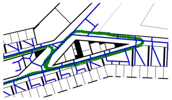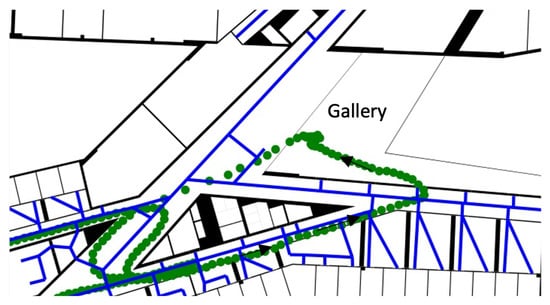 Part of the trajectory of the eight path, that wrongly proceeds in the “gallery”, when using the weighting by routing support method, where black arrows indicate the walking direction and the green points represent the position estimates for each step.
