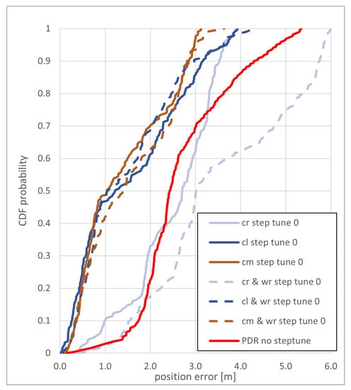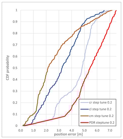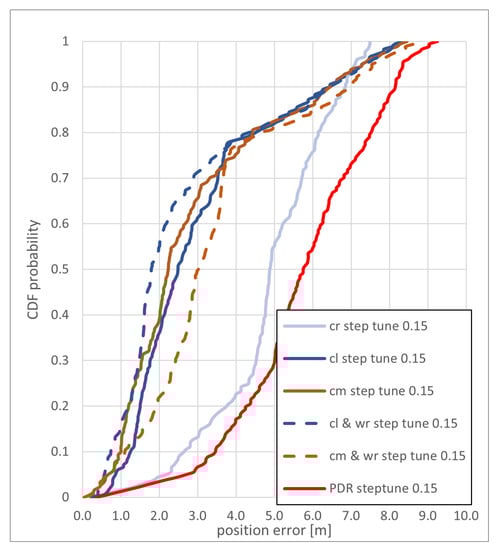 In this section, the results of the map-matching algorithm using the cr, cm, and cl method for particle checks are presented and discussed for the two test trajectories. The cumulative distribution function (CDF) of the position estimate error for the different concepts used for the eight path, with a step correction (manual step scale) of 0.1 m, is shown in Figure 9. The cm and cr method reached an overall similar accuracy, with the cm method reaching an accuracy of less than 4 m and the cr method reaching a accuracy of just less than 3 m in 90% of the steps.
