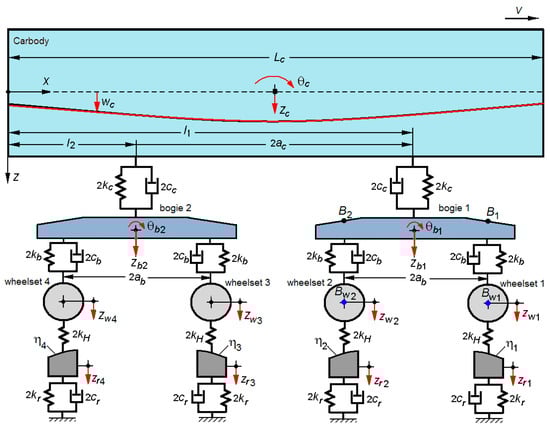 The vertical motions of the vehicle are described by the equations of the rigid vibration modes of the carbody and bogies–bounce and pitch, the equation of the first bending eigenmode of the carbody and the equations of the vertical displacements of the wheelsets.