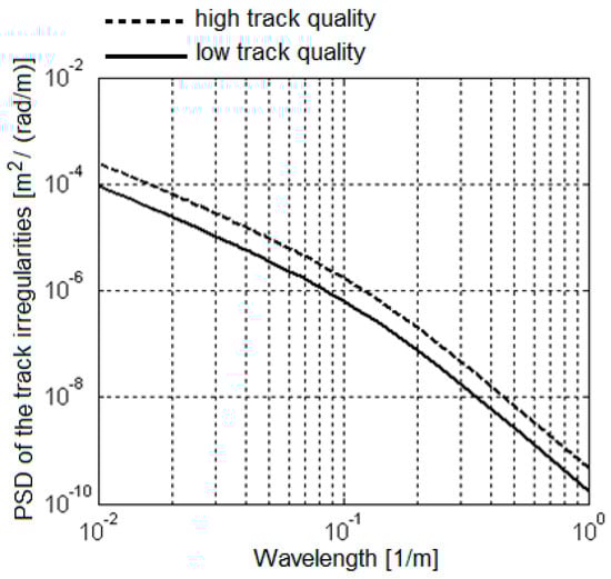 and is calculated based on the power spectral density of the vertical track irregularities (see Figure 2), described as per ORE B176 []