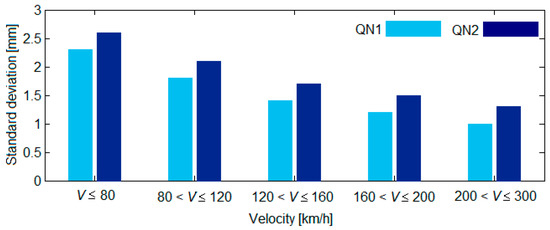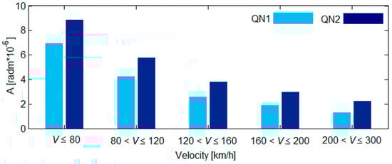 Figure 4 shows the values of AQN1,2 calculated via Equation (4), where σηQN1,2 has been assigned to various values corresponding to a QN1 track quality and a QN2 track quality, according to the UIC 518 Leaflet (see Figure 3).
