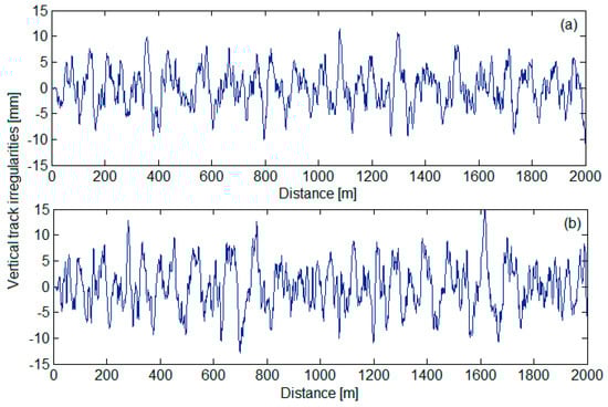 The values of the parameters of the numerical model of the vehicle–track system used in the numerical simulations were adopted in conformity with the characteristics of the passenger vehicle for which the bogie vertical accelerations were measured (see Table 1). The synthesis of the vertical track irregularities was conducted in accordance with the methodology introduced in Section 2.3, for a 2 km distance, for the standard deviations of the vertical irregularities corresponding to the QN1 track quality and QN2 track quality for the velocity interval of 120–160 km/h (see Figure 5).