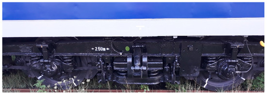 This section describes the architecture of the measurement chain for the bogie vertical accelerations of a passenger vehicle during circulation on a current line at the maximum velocity of 160 km/h, on different track sections in alignment and crosslevel. The vehicle is equipped with Minden–Deutz bogies (see Figure 6) with a maximum velocity of 140 km/h. The values of the RMS accelerations for each measurement section are also featured.