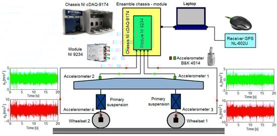 The architecture of the measurement chain for the bogie accelerations is shown in Figure 7. It comprises the components of the measurement system, acquisition, and processing of the bogie accelerations, namely four Brüel and Kjær 4514 accelerometers and the ensemble including the chassis NI cDAQ-9174 for data acquisition and the NI 9234 module for acquisition and synthesizing the data from accelerometers. To monitor and record the vehicle velocity, the receiver GPS NL-602U was used [,,,].