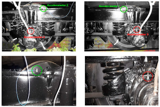 The four accelerometers are mounted on one side of the front bogie, according to the direction of travel, with one accelerometer on each axle box and one accelerometer on the bogie frame against the suspension of each wheelset. The position of the four accelerometers is shown in Figure 8.