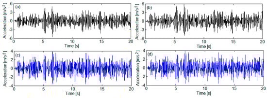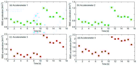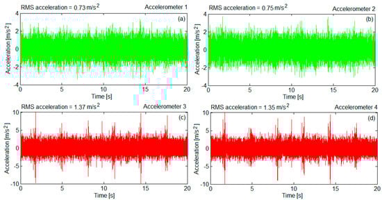 Recordings of accelerations during the circulation at the constant velocity of 137 km/h were made, for 17 measurement sequences of 20 s duration, with 2048 samples per second. For instance, Figure 9 presents the accelerations recorded by the four accelerometers on a measuring sequence.