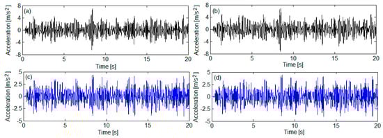 Example of accelerations recorded on a measurement sequence at the velocity of 137 km/h: (a) on the bogie frame above the wheelset 1; (b) on the bogie frame above the wheelset 2; (c) for the axle box of wheelset 1; (d) for the axle box of wheelset 2.