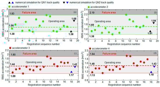 Values of the RMS accelerations for 17 measurement sequences: (a) on the bogie frame above the wheelset 1; (b) on the bogie frame above the wheelset 2; (c) for the axle box of wheelset 1; (d) for the axle box of wheelset 2.