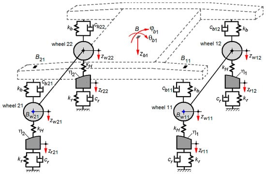 The bogie is connected to the carbody through the secondary suspension that is modelled via a Kelvin–Voigt system, with the elastic constant 2kc and the damping constant 2cc. Each wheelset is connected to the bogie chassis through a Kelvin–Voigt system, with the elastic constant 2kb and the damping constant 2cb. The primary suspension of the bogie is modelled by two Kelvin–Voigt systems corresponding to the wheelset of a bogie.