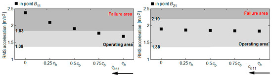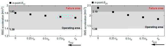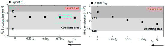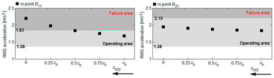 Based on the RMS accelerations in the reference points B11 and B21, shown in the diagrams in Figure 16, Figure 17, Figure 18 and Figure 19, the vibration response of the bogie chassis for the four failure cases was analysed. The diagrams show the areas of normal operating of the damper, identified in Section 4 (see Figure 13). The higher values of the RMS acceleration than the superior limit of the normal operating area will indicate a faulty operation of the damper.