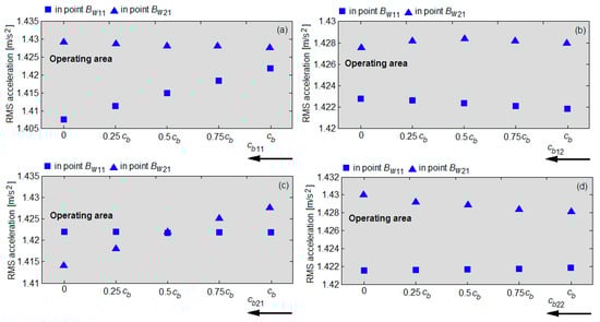 The possibility of detecting the condition of the dampers of the primary suspension of the vehicle based on the RMS accelerations measured on the axle boxes is further investigated. For this purpose, the diagrams in Figure 20 are used, showing the RMS accelerations of the wheels 11 and 21, calculated in the points Bw11 and Bw21 at the velocity of 137 km/h for the four failure cases in Table 3. In this case, small variations of the RMS accelerations are obtained by reducing the damping constant; the RMS accelerations remain in the normal operating area of the damper, namely 1.09... 1.90 m/s2 or 1.13... 1.94 m/s2, defined in Figure 13. Opposite trends of the RMS accelerations in the two wheels upon the reduction in the damping constant are highlighted—the RMS acceleration decreases in the wheel against the faulty damper and in the wheel opposite to the faulty damper and increases in the other wheel. For instance, when the damper fails in the suspension of the wheel 11 (diagram a) or in the suspension of the wheel 22 (diagram d), the RMS acceleration of the wheel 11 decreases, while the RMS acceleration of the wheel 21 increases. Should the damper in the suspension of the wheel 12 (diagram b) or in the suspension of the wheel 21 (diagram c) fail, then the RMS acceleration of the wheel 21 goes down, whereas the RMS acceleration of the wheel 11 goes up.