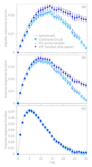 A further technical detail is that if (but only if) the true impulse response function converges to 0 well before the maximum lag , one can obtain more accurate estimates of at lags approaching , with correspondingly smaller uncertainties, by solving Equations (10) and (11) using the coefficients obtained from Equation (14) rather than using the and uncertainty estimates derived from Equation (14) itself. Users can choose between these two alternatives with the option in the function. If =TRUE, then the and their uncertainties are re-calculated via Equations (10) and (11) using the coefficients obtained from Equation (14). This is functionally equivalent to the Cochrane–Orcutt procedure, but is much faster because it does not require iteratively solving Equations (10) and (11) to determine the coefficients. Users should keep in mind, however, that if the true impulse response function does not converge to zero well before the maximum lag , setting to TRUE can lead to artifacts similar to those shown in Figure 1; thus, is set to FALSE by default.