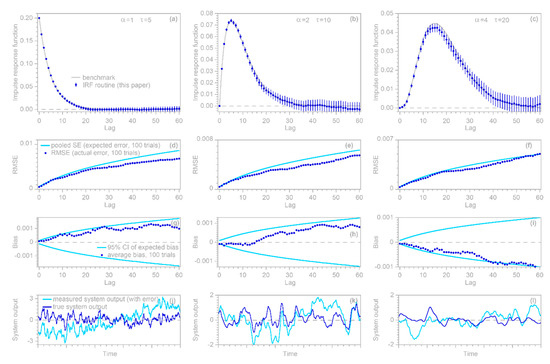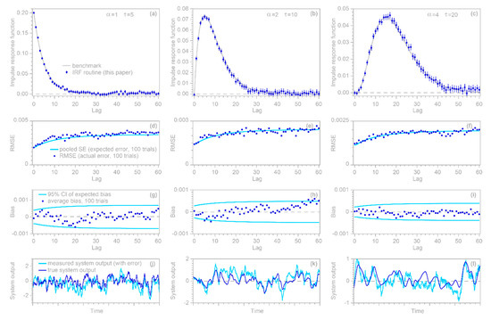 A simple benchmark test of the approach outlined above can be performed by generating a synthetic random input time series , , and convolving it with a known convolution kernel to yield the hypothetical system’s true output . A random ARMA error time series , generated with R’s function, is then added to to yield the hypothetical system’s measured output . This measured output and the input series are then supplied to the function, which estimates the impulse response function coefficients and their standard errors. One can then calculate the estimation error as the difference between and the known convolution kernel, and take the root-mean-square average of these estimation errors at each lag (RMSE) from many random iterations of the benchmark test. If this RMSE approximately equals the pooled (root mean square) average of the estimated standard errors over many random iterations, then the standard errors are reasonable estimates of the uncertainties in the . One can similarly calculate the mean estimation bias as the arithmetic average of the estimation errors at each lag. If this average estimation error scales roughly as the pooled standard error divided by the square root of the number of random iterations of the benchmark test, then this demonstrates that the estimates are unbiased (that is, no more biased than one would expect by chance) and the standard error estimates are realistic.