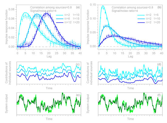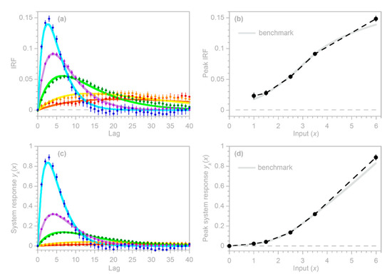 Conventional methods for estimating impulse response functions are based on the premise that the underlying system exhibits linearity and stationarity, that is, that the function in Equation (1) and the coefficients in Equation (3) depend only on the lag time or the lag index , and are otherwise constant (i.e., stationary), and in particular are independent of the input (i.e., linear). What if the real-world system is not linear and stationary, but nevertheless is analyzed as if it were? The benchmark tests in Section 4.3 above examined what would happen if time series from nonstationary (but linear) systems were analyzed as if those systems were stationary instead. The results showed that such cases can be expected to yield estimates (dots in Figure 6b and Figure 7e) that approximate the average of the actual, nonstationary impulse response (lines in Figure 6b and Figure 7e).