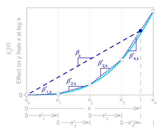 Readers may note a superficial similarity between Figure 15 and Figure 8. There is an important difference, however: in Figure 8, each IRF coefficient is expressed as a piecewise linear function of the input intensity , whereas in Figure 15, the IRF coefficients are expressed as piecewise linear functions of the lag . Whereas the broken-stick model in Figure 8 multiplies the number of coefficients that must be estimated (replacing each of the IRF coefficients with knots, for a total of knots in total), the broken-stick model in Figure 15 reduces the number of coefficients that must be estimated, substituting knots for all IRF coefficients.