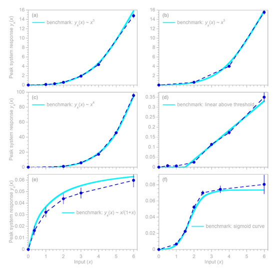 Benchmarks (light blue lines) and estimated peak system responses (dark blue dots) for benchmark tests featuring a range of nonlinear relationships between the peak system response and the input . In both (a,b), the benchmark’s peak response varies as the cube of the input, but knots divide the input values into six intervals in (a) and only three intervals in (b). The other relationships include a quartic curve (c), a linear function above a threshold (d), the Michaelis–Menten saturation curve (e), and a sigmoid curve (f). Except for some systematic bias in (e), the estimates derived from the approach outlined in Section 5.1 (blue circles) closely approximate the benchmark curves, with deviations similar to the estimated standard errors (as shown by the error bars, where these are larger than the plotting symbols).