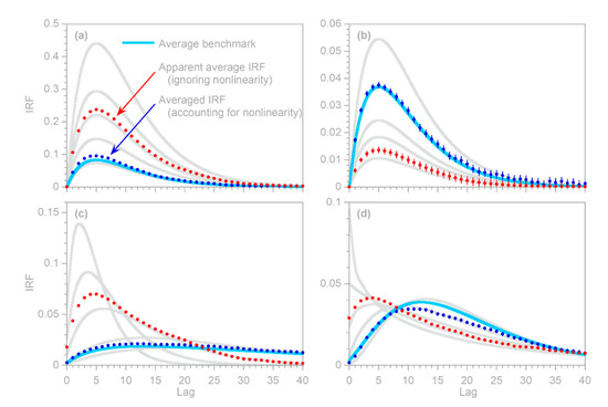 The substantial biases in these naïve estimates motivate the question of how the average impulse response functions can be estimated in nonlinear systems. The straightforward answer is that once the incremental impulse response coefficients have been estimated by regression via Equation (44), one can use Equations (43) and (47) to calculate and for any value of , and thus calculate their average from the distribution of . These estimates of , shown by the blue dots in Figure 14, generally follow the average benchmarks shown by the blue lines.