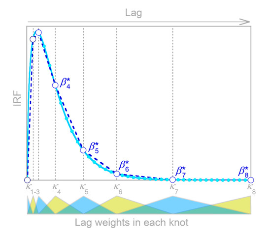 where the terms in curved brackets define a set of triangular weighting functions over lag time surrounding each knot lag , as shown below the x-axis in Figure 15. This approach converts Equation (4) into an equivalent regression with transformed variables,