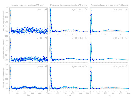 One can see from Figure 16 that the sharp short-term response is accurately depicted in all cases. However, the weaker, longer-term response is either obscured, distorted, or accurately revealed, depending on both the method that is used and the autocorrelation in the added noise. When the noise is uncorrelated (top row) or moderately autocorrelated (middle row), the longer-term response is obscured by scatter in the regular, evenly spaced IRF (Figure 16a,d). The piecewise linear IRF, by contrast, can clearly distinguish the longer-term response from zero (indicated by the dashed gray line in Figure 16b,c,e,f), because it averages over the random fluctuations in the noise. This averaging becomes somewhat less effective as the noise becomes more strongly autocorrelated, as shown by the progression from the top row to the bottom row in Figure 16. When the first-order autocorrelation in the noise is , implying a characteristic decorrelation time of roughly 20 time steps (bottom row of Figure 16), the scatter in the regular IRF is greatly reduced but replaced with artifactual coherent distortions (Figure 16g). These distortions are somewhat reduced, but still persist, in the piecewise linear IRF with 50 knots (Figure 16h), but are more effectively removed by the piecewise linear IRF with 20 knots (Figure 16i). This is because when the knots are more widely spaced, their averaging timescales become larger in comparison to the decorrelation time of the noise, and thus the noise can be more effectively averaged out.