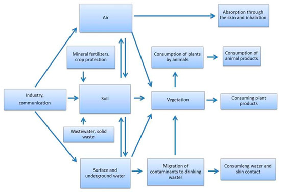 The largest sources of heavy metals in soil comes from bedrock, industrial emissions, communications, and agriculture (Figure 1). The mining, metallurgy, and chemical industries are among the largest anthropogenic sources of soil pollution [12,13].