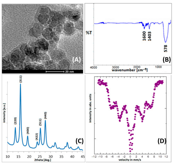 The IR spectrum (Figure 2B) of Mn0.2Fe2.8O4 nanoparticles show only bands typical for the procedure used. The intensive signals present below 600 cm−1 originate from the Fe-O bonds in magnetite [31]. Bands around 1400–1600 cm−1 and below 3000 cm−1 are characteristic of O–H [32].