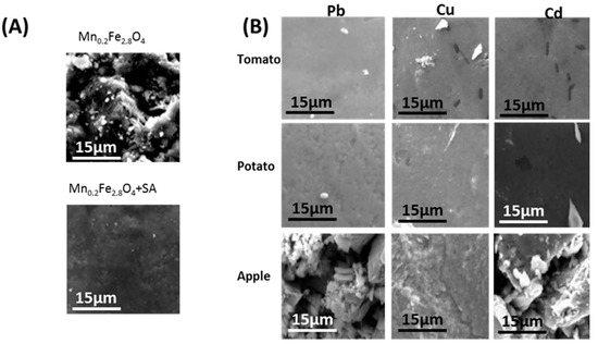 SEM images of films of (A) pristine Mn-doped ferrite nanoparticles; (B) nanoparticles after detection tests of heavy metals in selected food samples.