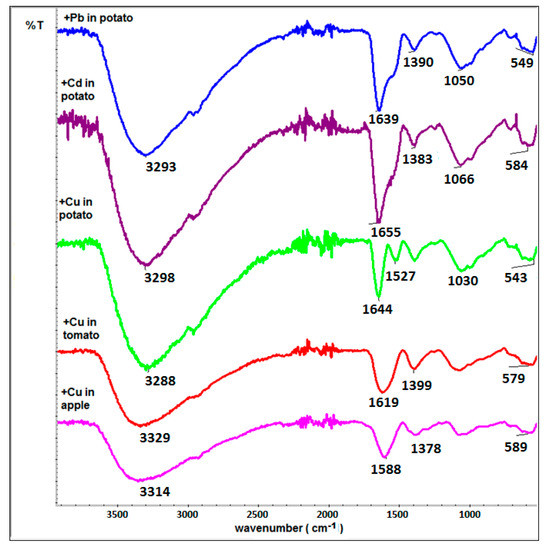 In Figure 2B, the IR spectrum of pristine Mn0.2Fe2.8O4 nanoparticles is presented. After surface modification and Pb, Cd, or Cu adsorption (selected spectra—Figure 4), spectra are richer. The more intensive bands at 1640 cm−1 originate from N-H bonds from primary amines, and bands around 1380 cm−1 which respond to C-H deformational vibrations are present [32]. Wide bonds around 3330 cm−1 are typical for O-H bonds in water, which is adsorbed on the nanoparticles’ surface since the organic matrix causes the presence of a very spongy surface coverage where water can be trapped. These bands are clearly related to the residues of the juice samples adsorbed on the surface of nanoparticles. As can be found in the literature, the modification of the IR spectra in the range 1300–1600 cm−1 can be related to the interaction of modified particles with heavy metals [24]. Therefore, the origin of signals in that range is most probably due to heavy ion adsorption.