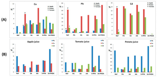 Detailed qualitative and quantitative studies show that detection from real matrixes (contaminated fruit extracts) is not an easy task. It is clear that that the analyzed elements, linkers used, organic matrix composition, and pH for detection are all important factors. All this leads to the conclusion that more studies on this subject are necessary, where the step-by-step process of the mentioned parameters are examined. In the studied series, the effective detection of Cd in potato and tomato juices by PA, SA, AA, and 3-PPA was evident. A high efficiency of AA in potato juice for each studied element was seen as well. The selectivity of adsorption related to the extracts and tested elements was also observed.