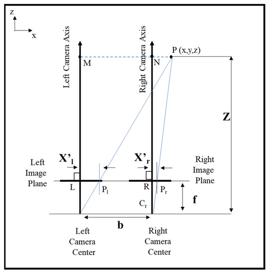 In Figure 3, the point P is a 3-D point in world coordinates. Point P is observed at points Pl and Pr in the left and right image planes, respectively. We assumed that the origin of the coordinate system coincided with the center of the left imaging sensor. From triangular similarity (ΔPMCl~ΔPlLCl), we obtain: