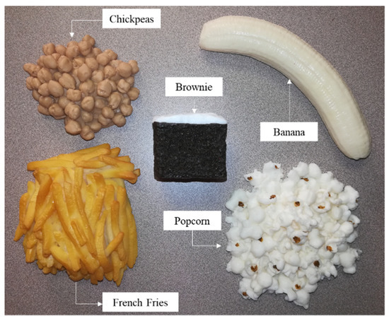 Five NASCO plastic food models—French fries, popcorn, chickpeas, chocolate brownie, and banana (Figure 4)—were selected to validate the proposed volume estimation method. The volume of each food item was measured using the water displacement method. Each food item was placed on a food tray.