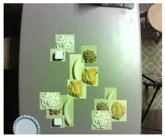 Random positioning of the test items on the table. The area covered by the FOODCAM was predetermined by capturing a test pair.