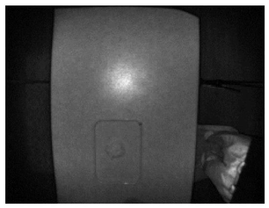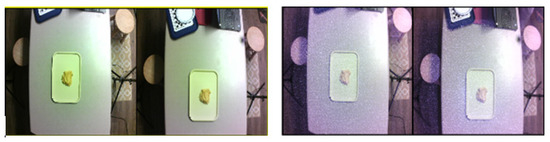 The test objects (with the tray) were placed at random positions on the table (Figure 5). At each position, four sets of stereo RGB and RGB + IR images were captured from the FOODCAM and four sets of depth and grayscale images were captured using the Pico Flexx cam. Samples of RGB and RGB + IR stereo image pairs are shown in Figure 6. Sample grayscale image captured from Pico Flexx camera is shown in Figure 7. The RGB + IR image pairs were used to obtain the food volume. RGB images can be used to identify the food items and used as masks for 3D models to better identify regions of interest in the image scene. Figure 8 depicts stereo image rectification. It can be seen in the image that the unrectified images were not aligned vertically. This misalignment is caused by the manufacturing of the FOODCAM device. Once the images are rectified, they are processed using the SGM algorithm for disparity estimates. Figure 9 depicts the disparity map obtained for a sample set for French fries.