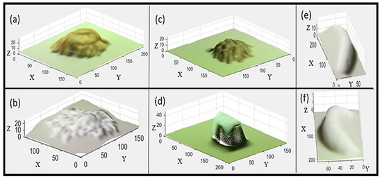 ROI point clouds—oblique view: (a) French fries, (b) popcorn, (c) chickpeas, (d) chocolate cake, (e) banana (oblique view—1), (f) banana (oblique view—2). All units are in mm.