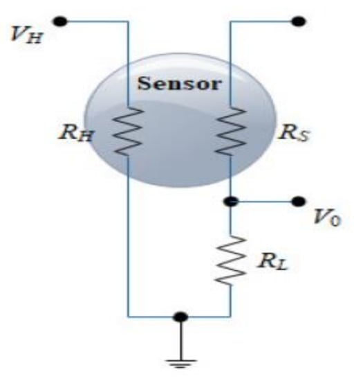 Generally, MOX gas sensors consist of metal oxide semiconductor layers that react to targeted gas based on the conductance principle. A simple electrical circuit can be developed to convert the change in conductivity to an output signal, indicating the gas concentration. A general electrical schematic diagram used to monitor the MOX sensor response is shown in Figure 1, where is the sensor resistance, is the load resistance, is the heater resistance, is the reference voltage for the measurement, is the voltage heater, and VL is the voltage across . The sensor resistance can be calculated using Equation (1).