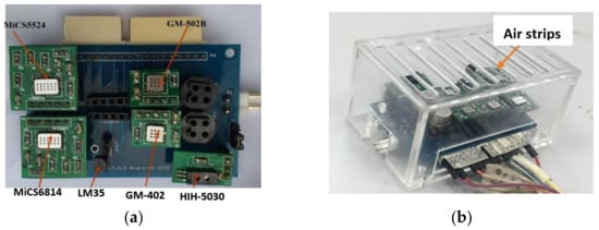 (a) Gas sensor modules developed; (b) fabricated partially closed chamber using acrylic with all gas sensor modules.