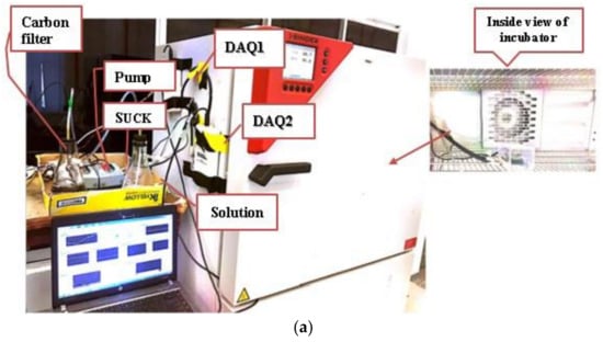 (a) Picture of hardware setup at incubator control; (b) schematic diagram for the experimental setup.
