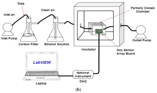 Figure 3 shows the hardware setup and a schematic diagram of the experimental setup. The hardware setup contained a measuring system for collecting gas sensor response data at variable temperatures, humidity, and ethanol gas concentrations to model the gas sensor response drift. The setup consisted of a sensor array module, temperature and humidity sensors, a Personal Computer (PC) with LabVIEW software, a data logger (DAQ), pumps, a power supply, an incubator, and a monitor. The gas flow started with the inlet pump feeding air into a carbon filter. A carbon filter was added in this experiment to clean the intake air and filter out VOCs that may be present and affect the experiment before the air was fed to the bubbler of the ethanol solution. The conical flask contained prepared ethanol solutions of different concentrations to produce varying gas concentrations during the bubbling process. The gas was then fed into the partially closed chamber, which contains the sensor array module (see Figure 2). The partially closed chamber would allow the exchange of gas in the incubator with the air inside the chamber to control the temperature and humidity. Finally, the outlet pump drained the gas to ensure a continuous flow. The outlet pipe was placed slightly above and in between the gas sensors in the array, ensuring that all sensors were exposed to the same gas concentration.